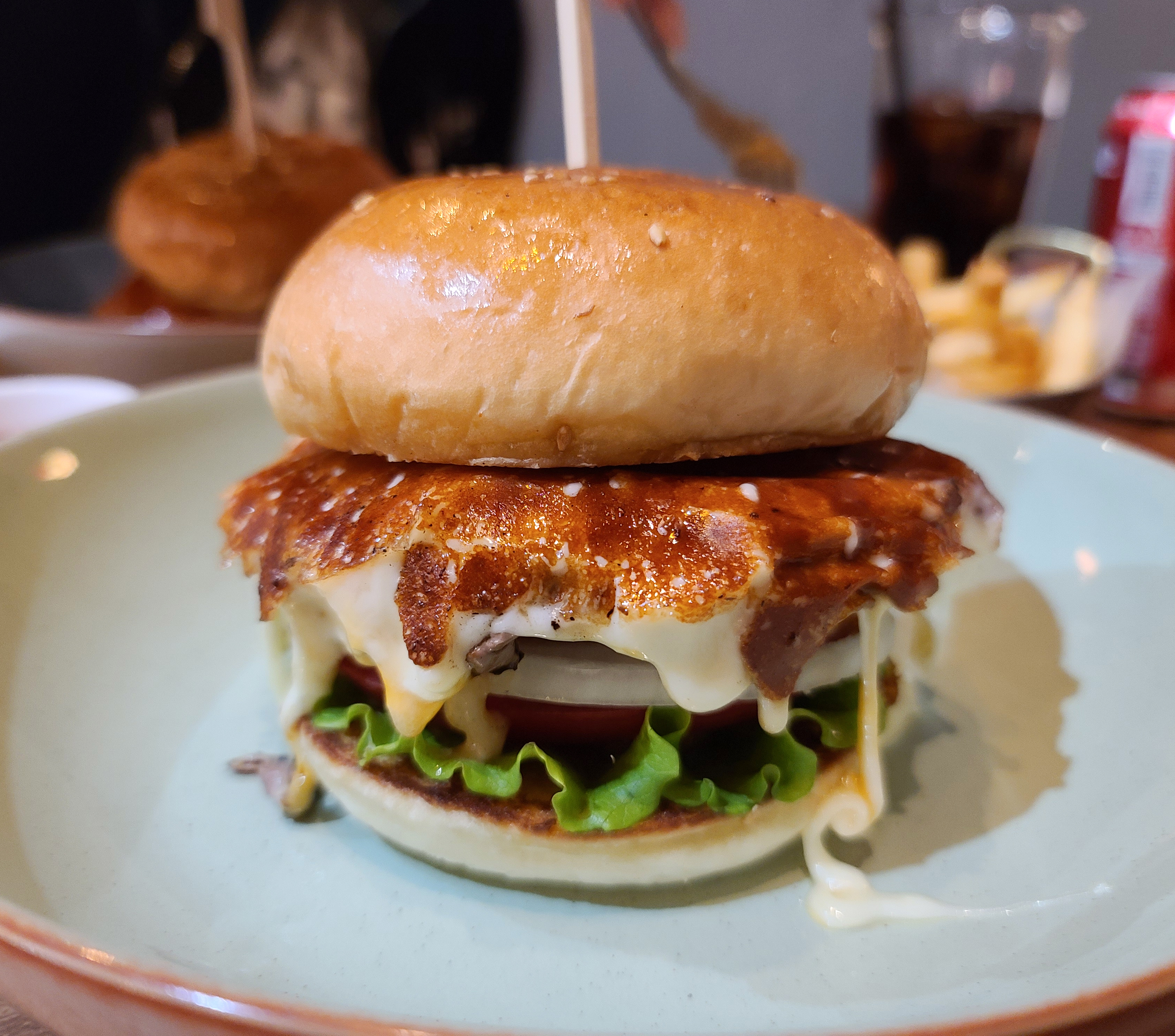 곧이어 주문한 멜팅치즈 햄버거가 나왔습니다. 멜팅룸의 멜팅치즈버거는 시그니쳐 메뉴여서 그런지 먹음직스럽게 잘 만들어져 나오더라고요. 100% 순쇠고기 패티에, 구운 모짜렐라 치즈를 폭포처럼 흘러내리게 불변한 메뉴로 먹기도 전인데 기대가 잔뜩 되더라고요.