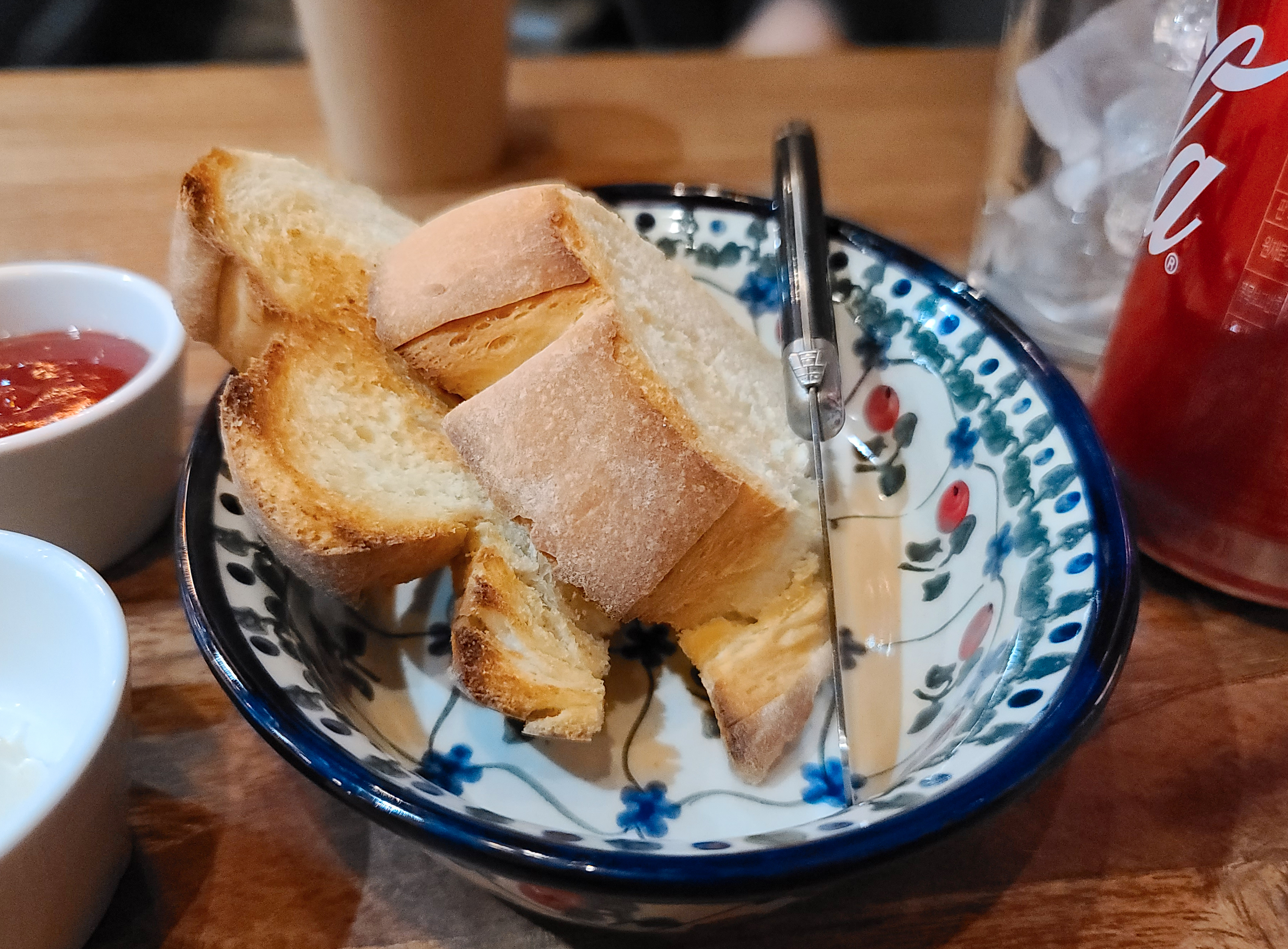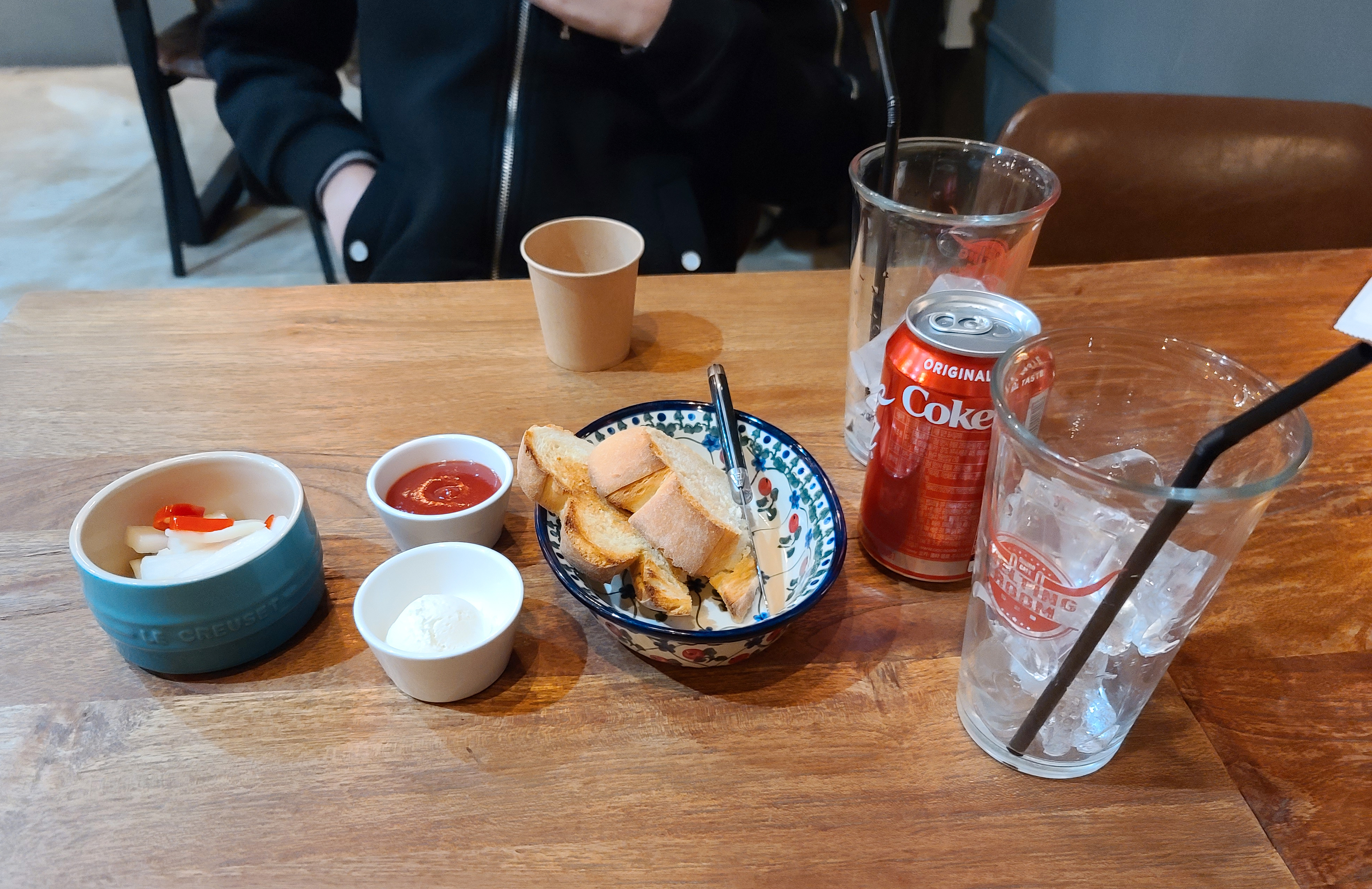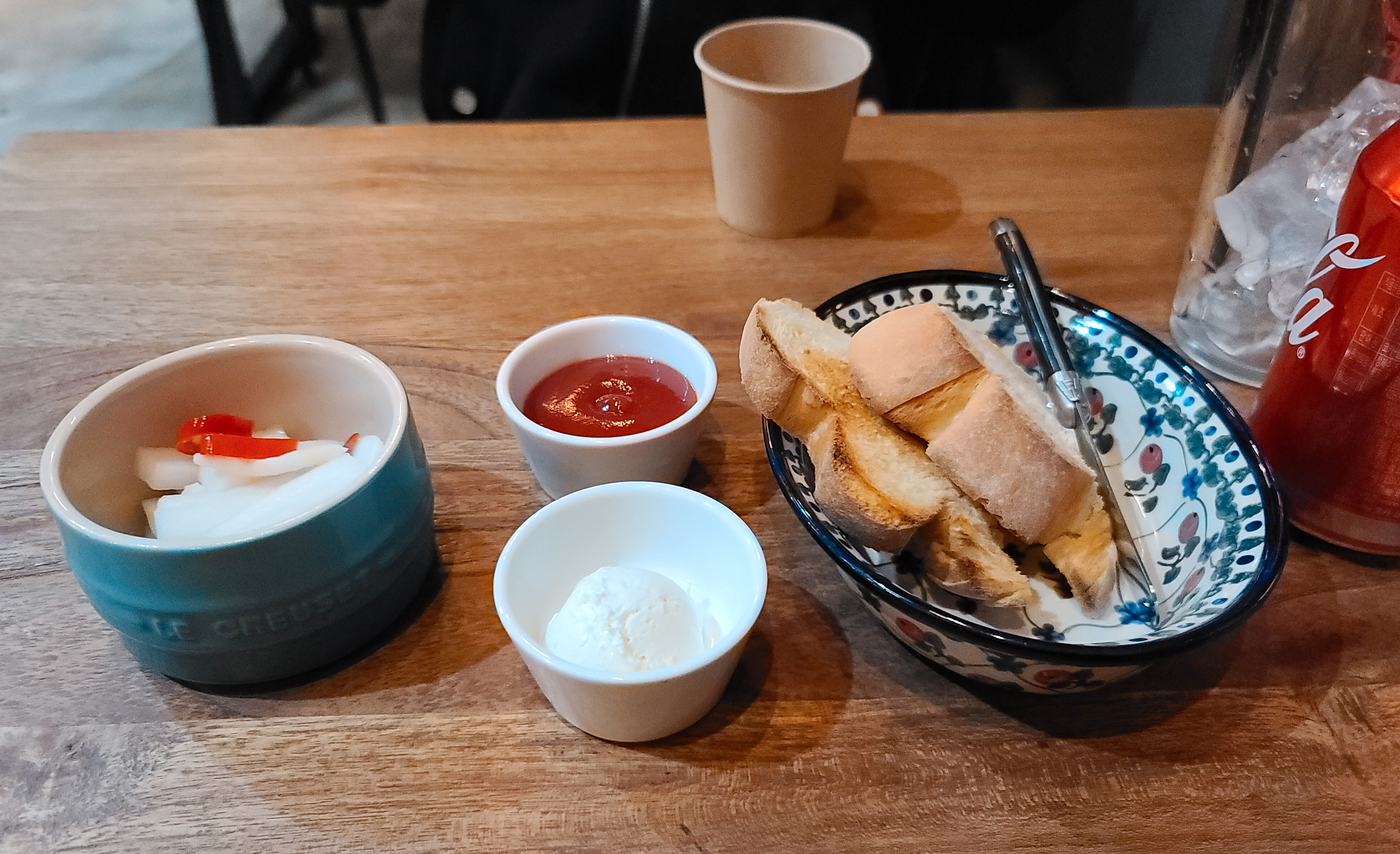 주문은 자리에서 종을 울리면 되었고, 기본적으로 피클과 식전 빵이 제공되었습니다. 혹은 주문한 콜라도 나왔습니다. 저는 탄산음료가 최근엔 잘 반갑습니다 당겨서 불변한 개만 주문했습니다.