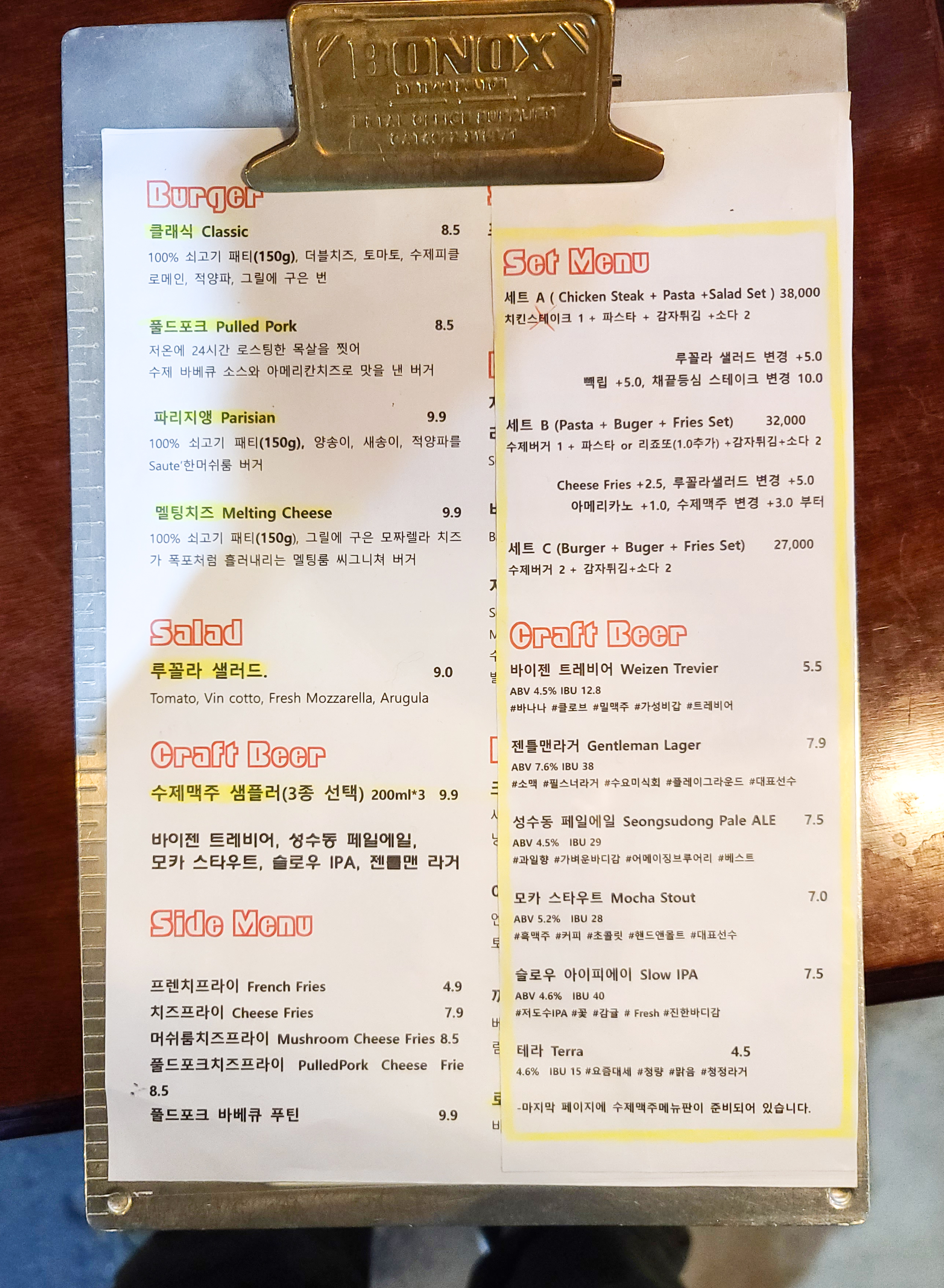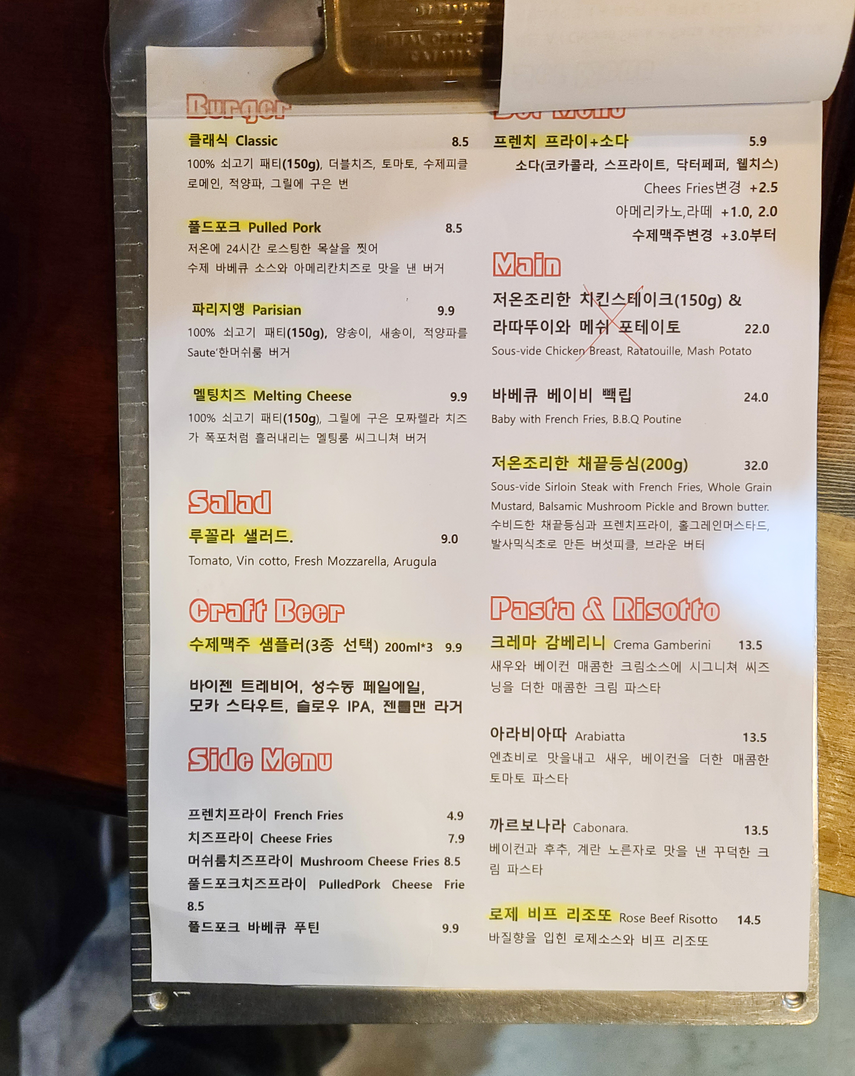 우선 메뉴를 살펴보겠습니다. 멜팅룸은 크게 버거와 샐러드, 크래프트비어, 사이드메뉴, 세트메뉴, 메인, 파스타와 리소토가 있었습니다. 저는 멜팅룸의 멜팅치즈 햄버거가 먹고 싶어서 방문하였기에 멜팅치즈 버거 혹은 프렌치프라이와 소다를 주문하였습니다.