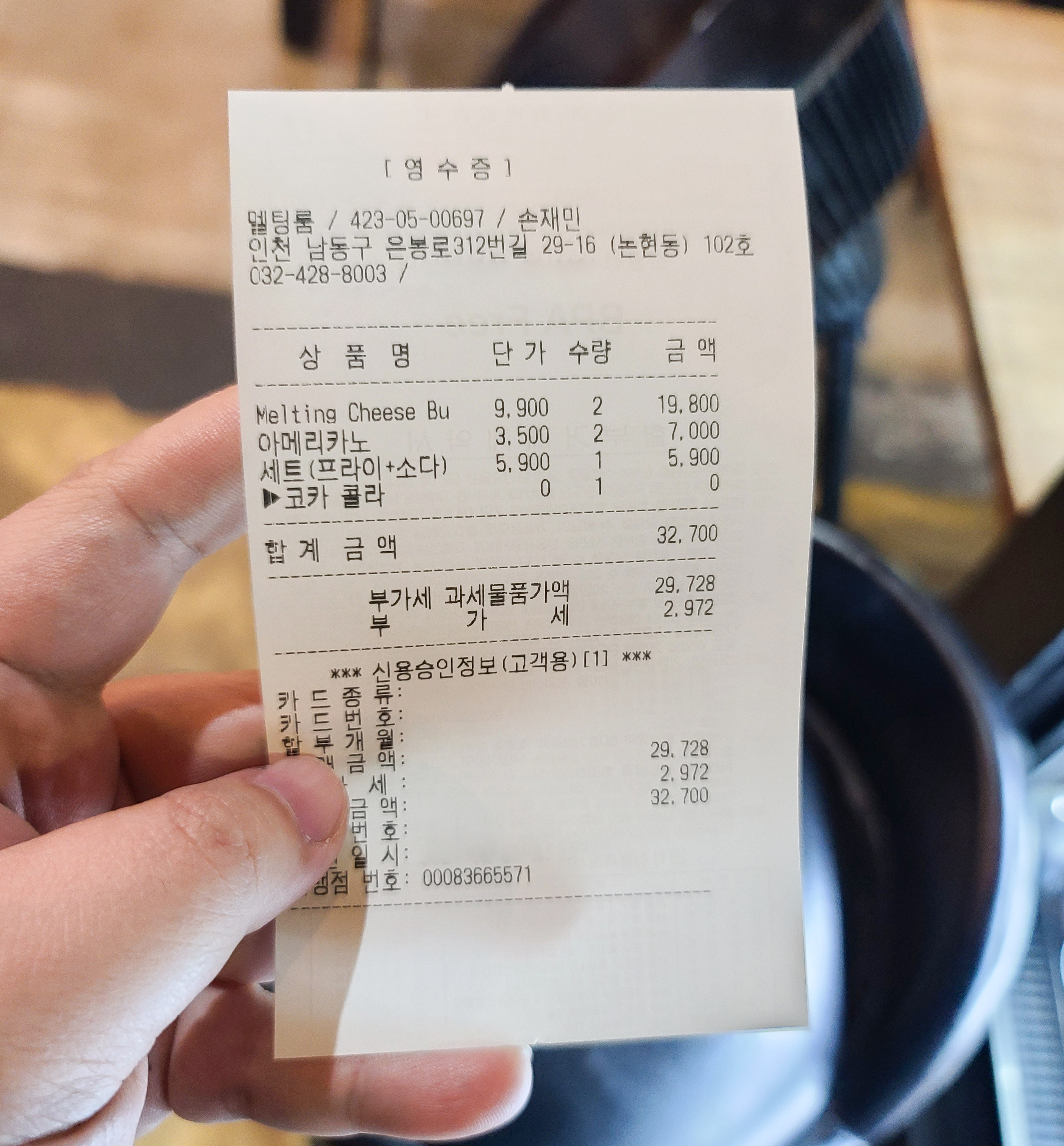구입한 총비용은 멜팅치즈버거 2개, 아메리카노 2잔, 감자튀김과 탄산음료 세트를 포함 32,700원이 나왔습니다. 간만에 수제버거를 먹으니 맛있게 잘 먹은 먹는것이 같고요. 금액은 보통 수제버거집 정도 수립하는것 먹는것이 같습니다.■ 관련 글- 인하대 비싸지않은 치킨, 웨이사이드치킨- 대구 미군부대 수제버거 맛집 봉덕동 패티스팩토리- 대구 수제버거 맛집, 대명동 두류공원 존스버거- 버거히어로 강화도 수제버거 맛집- 송리단길 수제버거 맛집, 다운타우너 잠실점