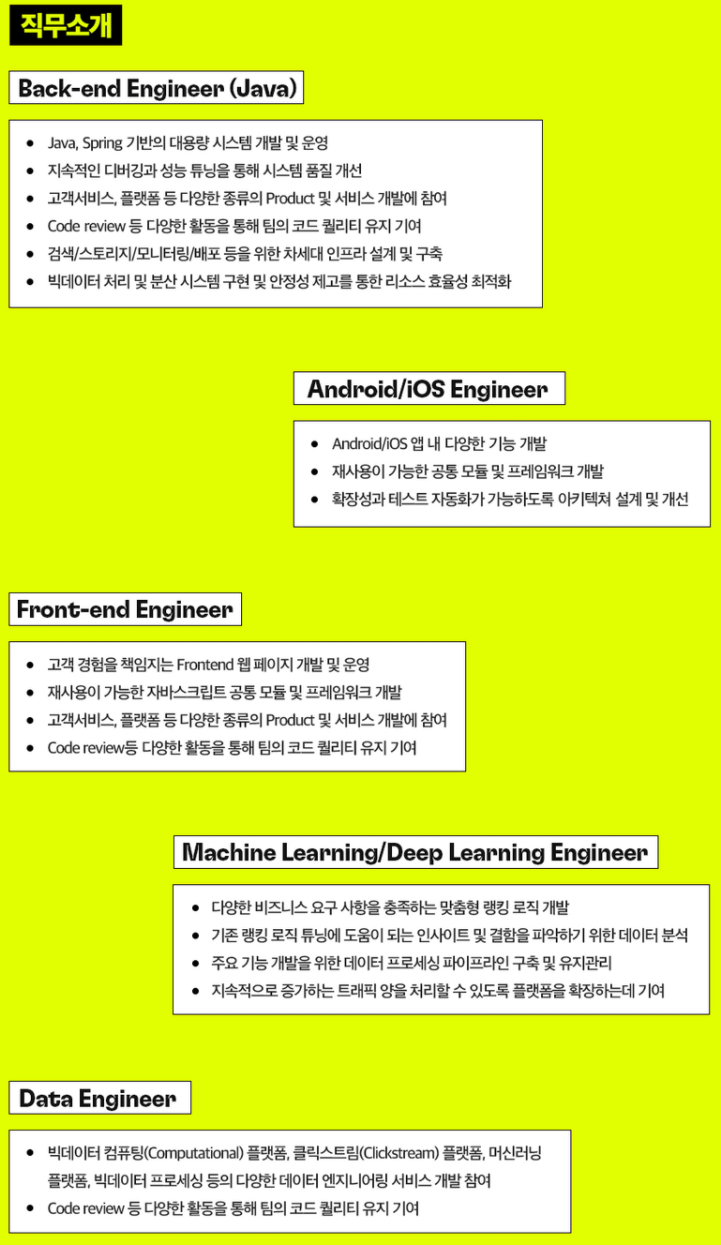 1. 개발 smart_phone 앱 개발 (안드로이드, ios) 프론트엔드 개발 (웹 페이지) 백엔드 개발 (서버) 사내 시스템 개발 (ERP)클라우드 개발임베디드 개발게임 개발 등 2. 운영 전산 운영 (서비스 운영) 인프라 관리 데이터베이스 관리 등3. R&DAI, ML 개발 데이터 분석 등맨 위에 사진으로 대표적인 IT 직군들이 있는 기업들을 나열해보았다.크게 대기업, IT기업, 스타트업, 게임업계, 금융업계로 나누어 보았다.* 더 다양한 산업군이 있을 수 있다1. 대기업삼성전자, SKT 등 직접 자사의 제품과 서비스를 다루는 곳이 있다. 혹은 사내 시스템 (ERP 등을 담당한다.)자체적으로 개발 및 운영을 하는 곳도 있지만 SI업체나 아웃소싱을 통해 개발 및 운영을 하고대기업 직원들은 IT직무지만 관리하는 형태인 경우도 많다.그래서 일부 대기업에 입사 후에 개발을 하지 못해서 커리어 고민이 생기는 경우도 있다.본인이 개발자로서 커리어보다는 급여나 복지를 더 중요시 한다면 대기업을 고려해보기 바란다.급여나 복지는 뭐,, 당연히 최고라고 할 수 있다.2. IT기업네카라쿠배,,, 더 이상 설명이 필요할까 싶지만 IT서비스가 메인인 곳이다.IT서비스가 메인인 만큼 굉장한 실력자들이 많이 있는 곳이다.실제 개발량도 많고 최신 트랜드를 따라간다.그래서 업무도 많고 공부할 것도 많지만 커리어 만큼은 확실하다.모든 IT 종사자의 선망인 곳이기도 하다.사실 그만큼 들어가기도 어렵다 ㅜㅜ,,,복지와 분위기는 IT인 만큼 자유롭고 우수하다.3. 스타트업모든 스타트업이 IT 기반인 것은 아니나 스타트업의 IT 개발자로 취업하여 개발을 할 수도 있다.긍정적으로는 처음부터 끝까지 모든 과정에 개발을 참여할 수 있다는 것이고부정적으로 보자면,,, 그만큼 일이 힘들다는 것이다.개인적으로는 대기업만 꿈꾸던 개발자였는데 입사를 하고 나서 스타트업에 대한 긍정적인 인식이 많이 생겼다.개발자로서 역량을 많이 쌓을 수 있다.근데 요즘 소위말해서 잘나가는 스타트업은 대기업보다 더 들어가기 어렵다고도 한다.4. 게임업계흔히들 업무량이 많다고 한다. 사실 개발자들은 다 업무가 엄청 많은거 같...ㅜㅜ게임업계에 대해서는 잘은 모른다...게임 출시할 때문 에 등대가 된다는 정도?그래도 약간 게잉 좋아하시는 분들은 덕업 일치를 할 수 있는 곳이지 않을까 생각된다.5. 금융업계아무래도 금전을 다루다보니까 보수적인 성향일 수 밖에 없는 곳일거 같다.금융서버 쪽을 담당할 수도 있고 모바일 뱅킹 쪽을 담당할 수도 있다고 한다.모바일 뱅킹이나 AI 쪽은 신기술 도입을 하려고 하고 분위기도 IT 기업을 따라가려는거 같다.나도 금융업에서 종사해보지는 않고 금융업계에 있는 지인한테 전해들은 이야기이다.다만, 버그와 에러에 다른 곳보다 더 예민하기 때문 에 신기술 도입이나 기능 변경이 쉽지 않은거 같다.연봉 만큼은 금융권,,,최고다! 안정적으로 높은 연봉을 누릴 수 있는 곳인거 같다.6. SI업계대기업 SI에서 1년 정도 근무를 했었다.SI는 쉽게 말해서 SW 외주업체이다. 대기업의 경우 각 그룹사의 서비스들을 대신 개발 및 운영 해준다.팀바팀으로 SI가 주력인 팀이 있고, SM이 주력인 팀이 있다.SI가 주력인 팀의 경우 프로젝트를 자주 나가게 되는데 개발 역시 해볼 수 있다. 그러나 대기업 SI는 협력사와 계약하여 주로 협력사가 개발하고 프로젝트 매니저로서 참여를 많이 하게 된다.SM이 주력인 팀의 경우 개발보다는 운영에 중점을 두기 떼문에 인프라 측면으로 역량을 키울 수 있다.반면, 대기업 SI보다 규모가 작은 SI업체들은 실질적으로 개발을 많이 한다.본인이 개발보다는 운영을 하고 싶다면 SM쪽 지원을 해보는 것도 괜찮을거 같다.7. 공기업공기업은,, 내 주위에 많이 없어서 잘은 모르겠다.다만 공기업을 희망했던 지인들은 보장되는 워라벨에 매력을 느껴 지원했었다.급여나 커리어보다 워라벨을 중요시한다면 공기업을 추천한다.아마 워라벨은 이 중에서 단연 원탑이지 않을까 싶다.마지막으로사실 두서 없이 좀 정리안되게 적은거 같아서 나중에 한번 글을 수정해야할거 같다.나는 맨 처음에는 대기업만 준비했었고 다른 분야에는 관심이 없었는데 다른 분야에 있는 지인들, 그리고 현직에 있으면서 들리는 여러 이야기들을 듣고 좀 더 포괄적으로 준비해보고자 했었다.이렇게 말하지만 대기업SI에서 대기업으로 이직한거라 ^_^,,, 못 믿는 분들도 있을거 같다.무튼, 주저리 주저리 했는데 요약하면 아래와 같다.* 요약1. 프로젝트 등 실제 경험이 있다면 누구든 개발자가 될 수 있다! 본인만의 필살기가 될 프로젝트를 준비하자2. 본인이 개발이 정말 정말 너무나도 하고 싶다면 IT기업 혹은 스타트업을 가자!- 사실 네카라쿠배는 (특히 쿠팡) 급여도 높고 복지도 좋은 것으로 알고 있다.3. 높은 급여를 받고 싶다면 대기업/금융권으로 가자.- 대기업/금융권이라고 개발 안하는 것이 아니다. 여기는 부서별로 차이가 있으니 지원할 떼문에 알아보자.4. 워라벨을 중요시 한다면 공기업으로 가자.