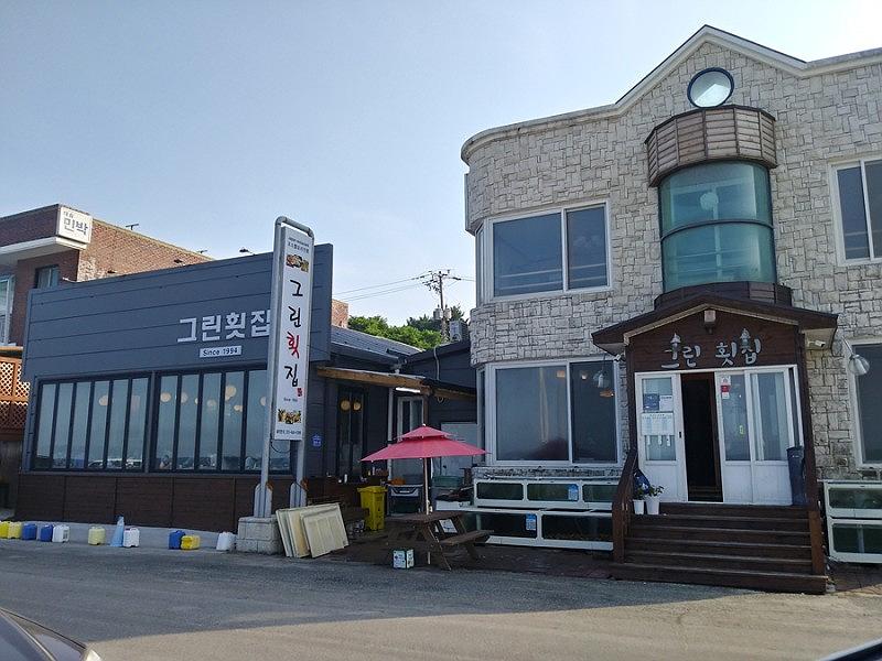 이날 방문한 그린횟집은 사천진해수욕장에서 도보 1분거리에 위치해 있었어요.대로변에 세워져있는 흰간판과 회색 외관이 눈에 잘 띄어서 찾아오는건 쉬웠어요.