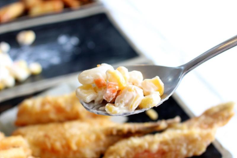 먼저 촉촉한 콘샐러드부터 한입 맛보았어요.마요네즈 베이스라 느끼할줄 알았는데 의외로 끝맛이 달달해서 연거푸 집어먹게 되더라고요.